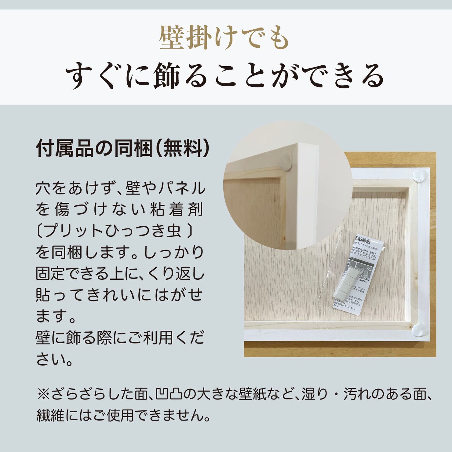 壁に飾るに便利な、くり返し貼ってきれいにはがせる粘着剤を同梱します。