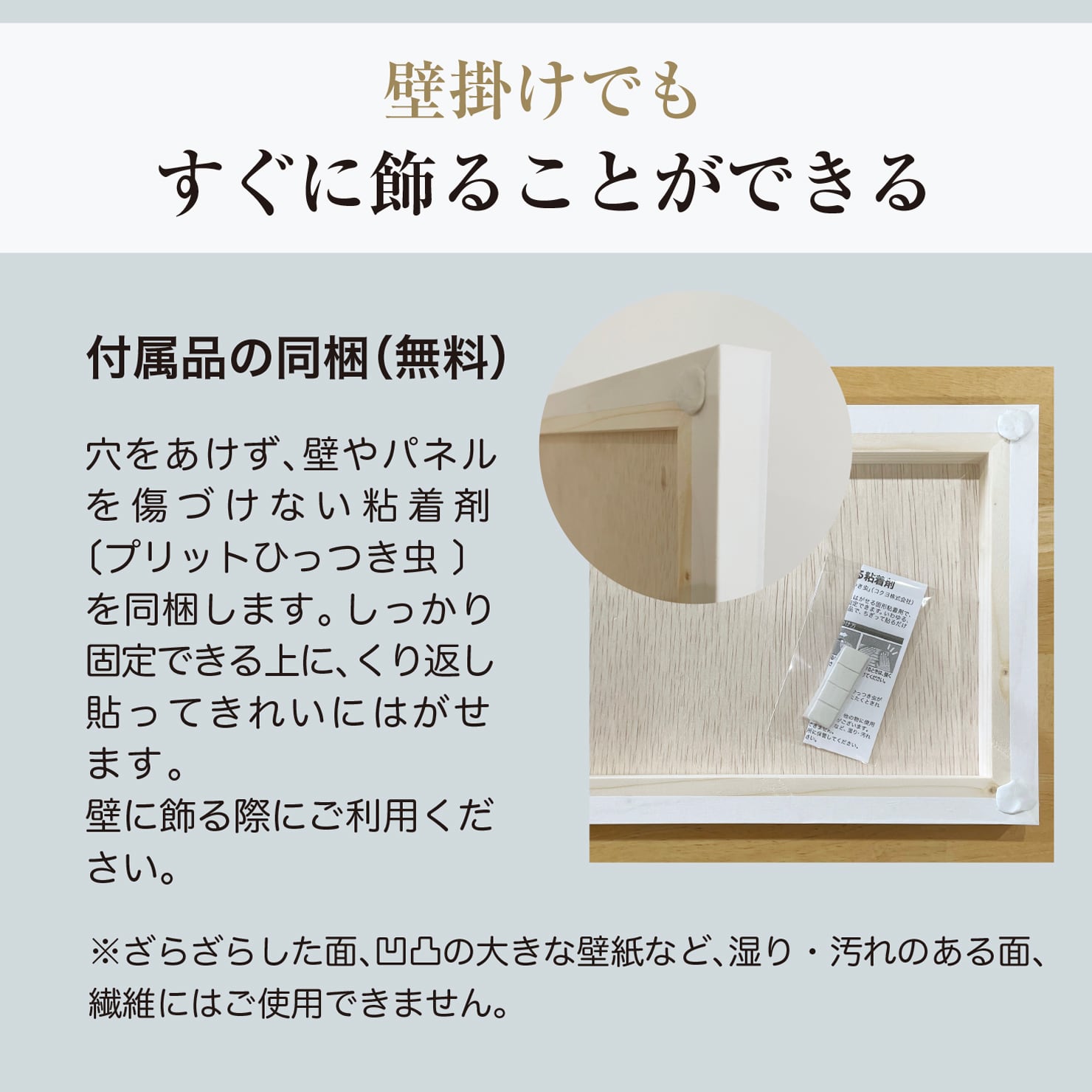 【付属品】壁に飾るに便利でくり返し貼ってきれいにはがせる粘着剤を同梱します。壁を傷付けずしっかり固定できます。〔プリットひっつき虫 〕