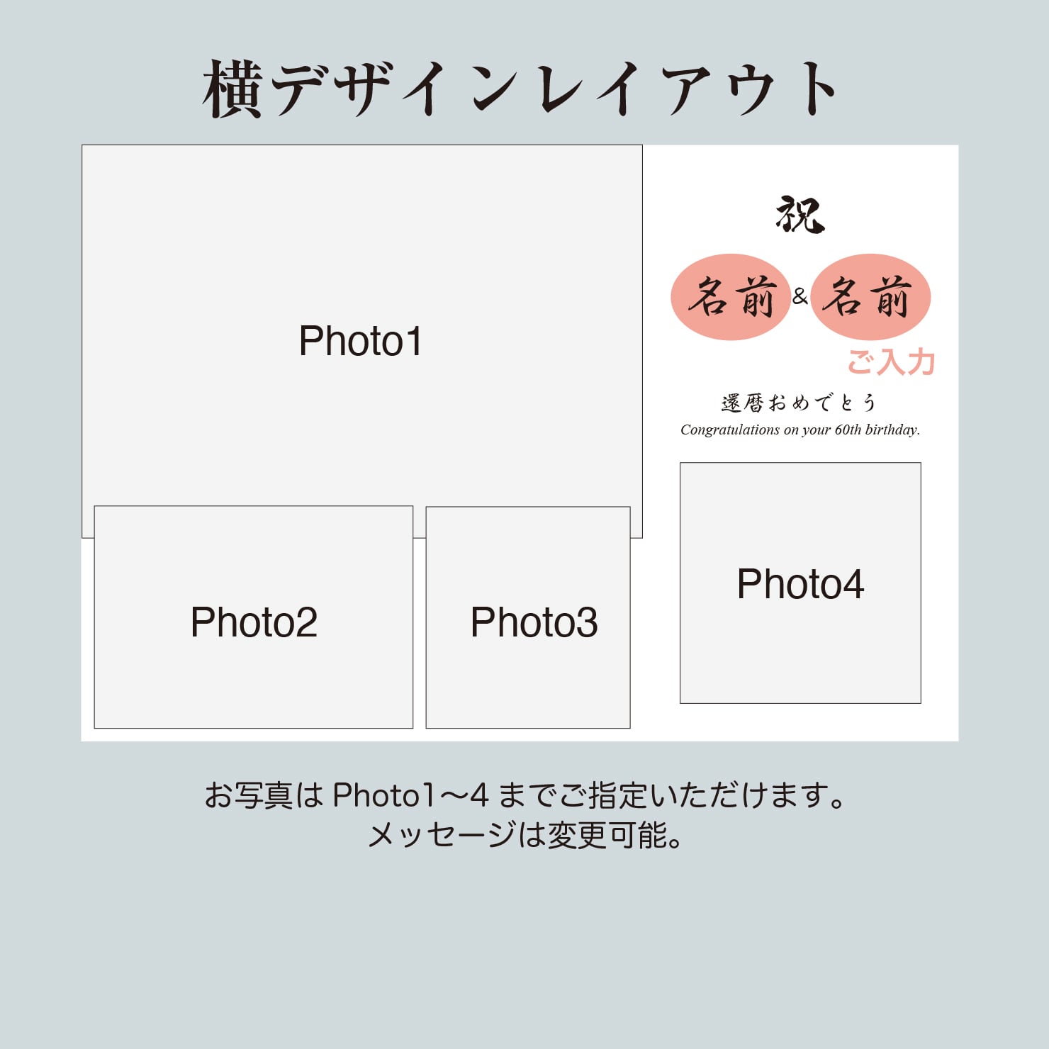 メッセージは「還暦おめでとう」の日本語表記と英語表記両方になります。
